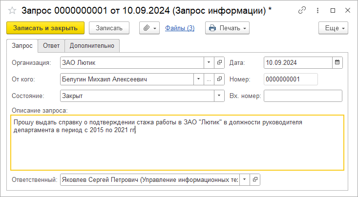 К запросу можно прикрепить файлы (например, файл самого запроса, файл ответа) по ссылке Файлы на командной панели.