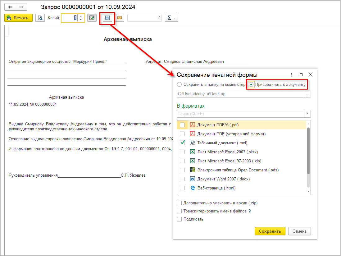 В запросе предусмотрены печатные формы: Архивная справка и Архивная выписка. Их можно сохранить или присоединить к документу.