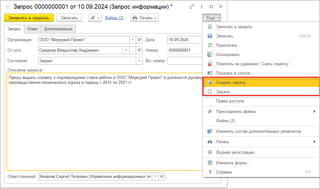 На основании запроса информации можно создать задачу. Для этого в меню Еще карточки запроса предусмотрена команда Создать задачу.