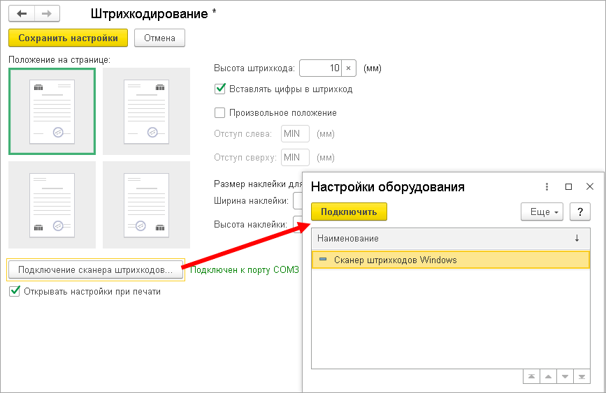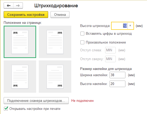 ■ Открывать настройки при печати – для выбора положения штрихкода на странице;
