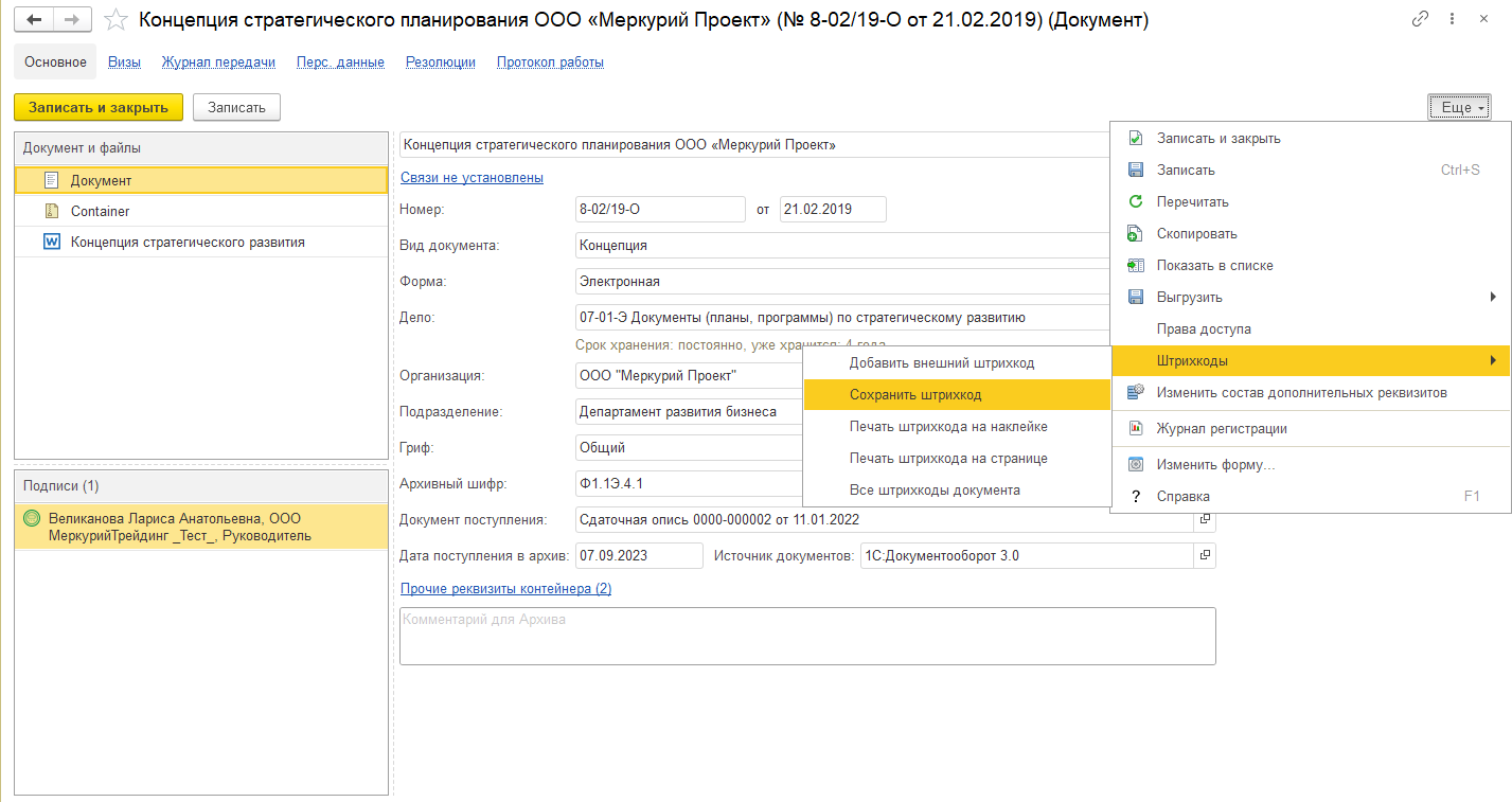 В 1С:Архиве в файлы автоматическая и ручная вставка штрихкода средствами системы невозможна. Для этого в группе команд Штрихкоды (меню Еще списков документов и дел и в их карточках) предусмотрена команда Сохранить штрихкод.