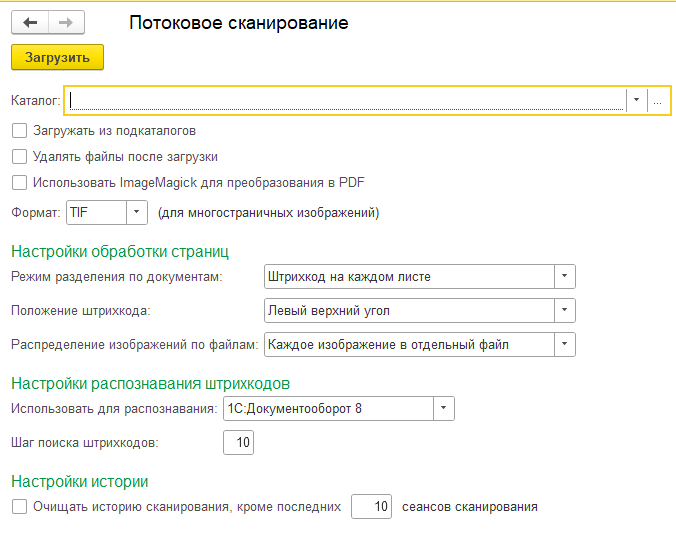 В поле «Каталог» нужно выбрать папку, в которой лежат отсканированные файлы для распознавания и помещения в 1С:Архив.