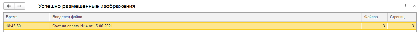 Указано время сканирования, документ, найденный по штрихкоду в файле, в который были добавлены изображения, количество добавленных файлов и страниц. Более детально по каждому документу можно просмотреть информацию двойным кликом по строке: