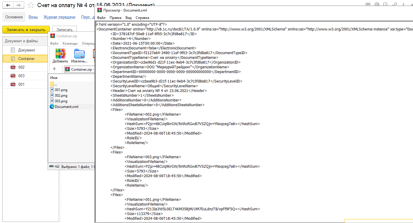 Добавленный файл присутствует в контейнере и информация о нем отображается в файле описания метаданных: