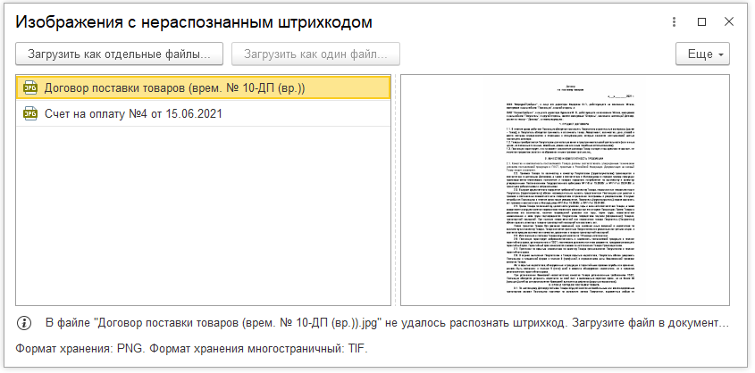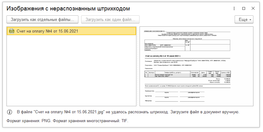 Для изображений с нераспозннным штрихкодом в 1С:Архиве предлагается загрузить файлы в документ вручную двумя способами: