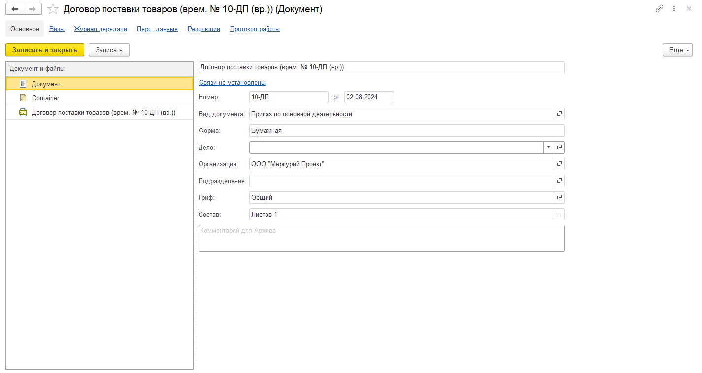 ■ документу (форма документа – Бумажная, у документа нет Источника, то есть создан в 1С:Архиве)