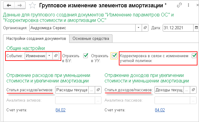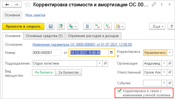 Важно: так как в версии 2.4.14 нет справочника События ОС, то алгоритм корректировки амортизации срабатывает при любом вводе документа Корректировка стоимости и амортизации ОС на основании документа Изменение параметров ОС.