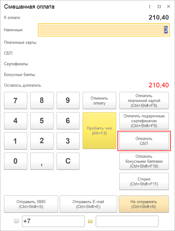 Также кнопка Оплатить СБП добавляется на форму смешанной оплаты, открывающуюся при оформлении из РМК документов Чек ККМ и Реализация подарочных сертификатов.
