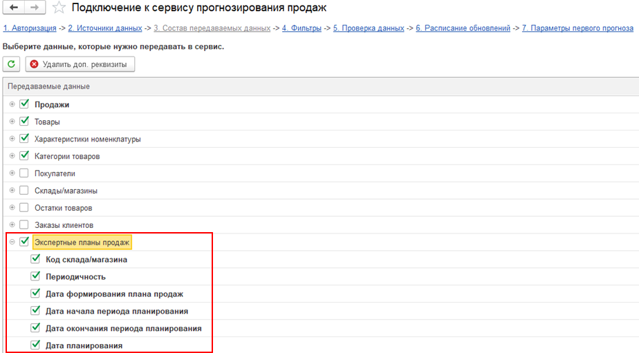 На закладке Состав передаваемых данных становится доступна коллекция Экспертные планы продаж.