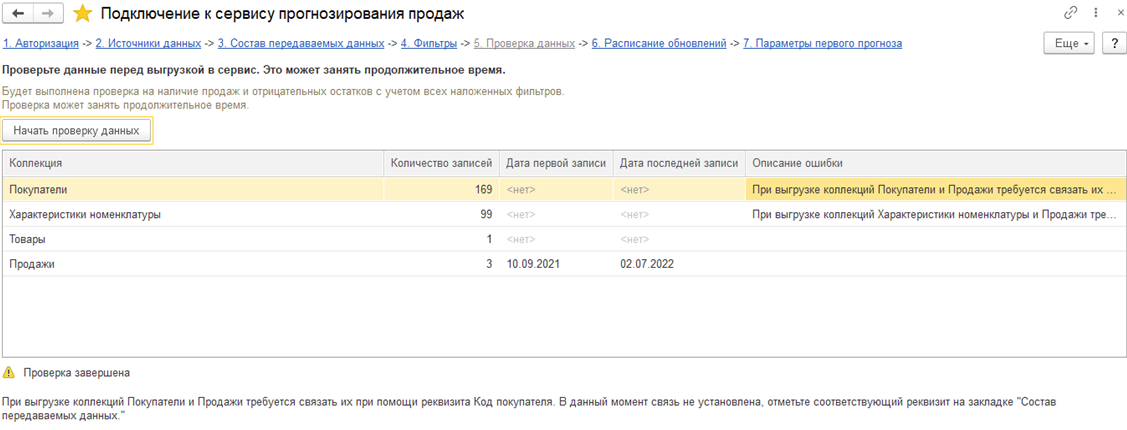 На закладке Состав передаваемых данных в помощнике подключения доступна коллекция «Характеристики номенклатуры» и необходимые поля связи в коллекции «Продажи», «Заказы клиентов», «Экспертные планы продаж», «Промоакции», «Сезонность».