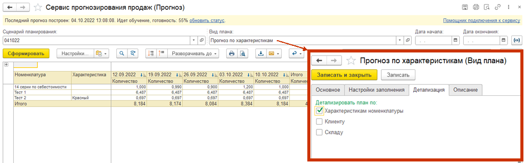 В некоторых случаях требуется детализация прогнозирования до характеристик номенклатуры. Для такой возможности в Виде плана предусмотрена возможность установки флага детализации по характеристикам номенклатуры.