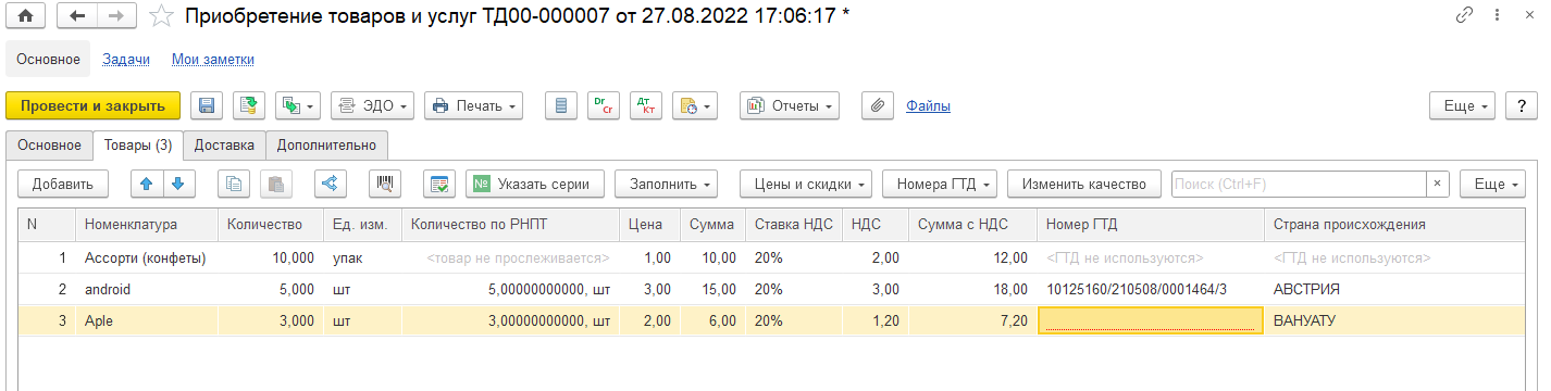 | ГТД 44444 | 1 | шт. |