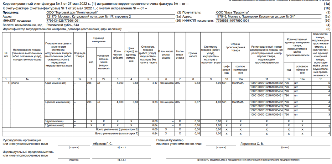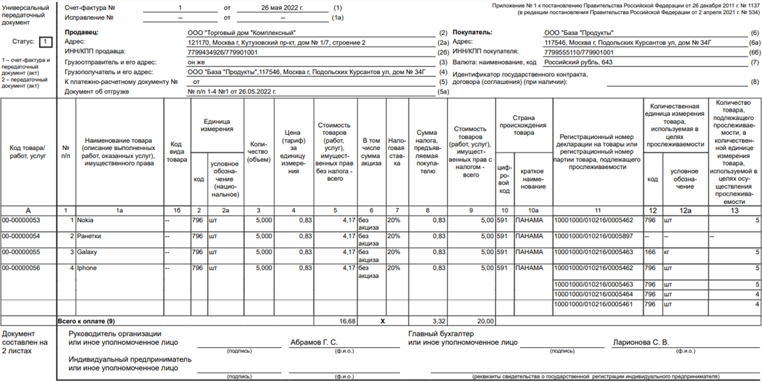 При последующей реализации набора (комплекта), поскольку в состав набора (комплекта) входит товар, подлежащий прослеживаемости, счет-фактура или универсальный передаточный документ подлежит формированию в электронной форме. При этом в новых графах счета-фактуры, содержащих реквизиты прослеживаемости (регистрационный номер партии товара, подлежащего прослеживаемости (далее – РНПТ), количественная единица измерения товара, используемая в целях осуществления прослеживаемости (код и условное обозначение), количество товара, подлежащего прослеживаемости, в количественной единице измерения товара, используемой в целях осуществления прослеживаемости), подлежат отражению реквизиты прослеживаемости по каждому товару, подлежащему прослеживаемости, включенному в набор (комплект), в подстроках к строке с набором (комплектом).