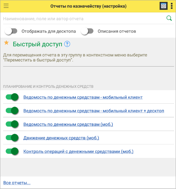 В мобильном клиенте в режиме Настройка выбор назначения вариантов отчетов доступен с помощью переключателя Отображать для десктопа.