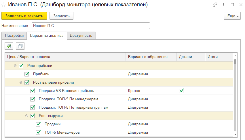 На закладке Варианты анализа карточки элемента справочника Дашборды МЦП необходимо выбрать: