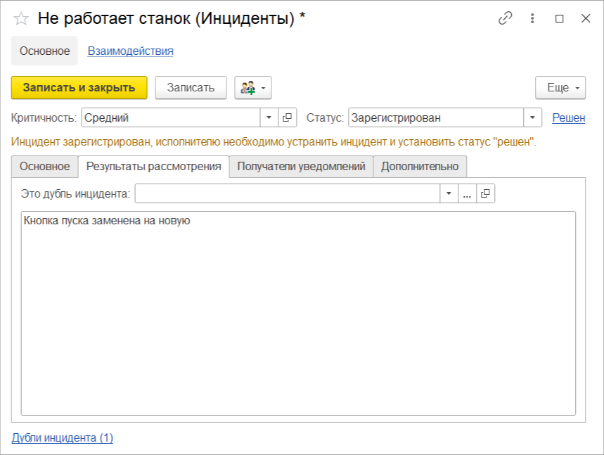 Если рассмотрение инцидента находится в зоне ответственности текущего исполнителя и инцидент не является дублем, то он принимает решение по инциденту и указывает результат рассмотрения на закладке Результаты рассмотрения и переводит инцидент в статус Решен.