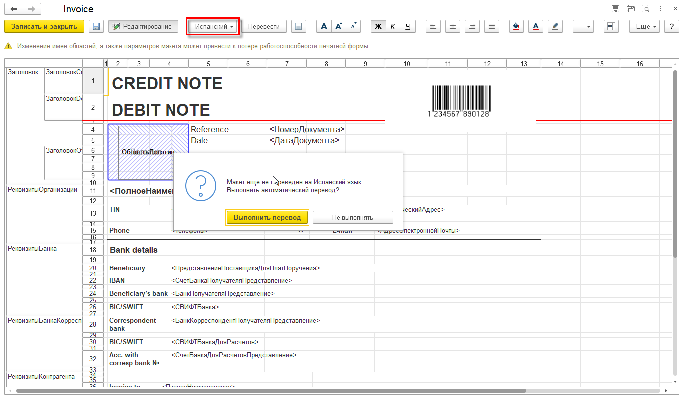 Если печать выполняется с языком отличным от основного, то используются международное наименование и адрес организации и контрагента, а также международные реквизиты банка.