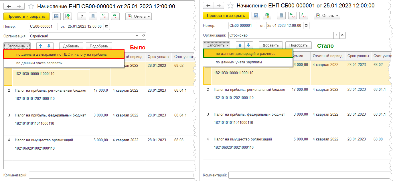 В контекстном меню кнопки Заполнить документа Начисление ЕНП команда по данным деклараций по НДС и налогу на прибыль переименована в по данным деклараций и расчетов.