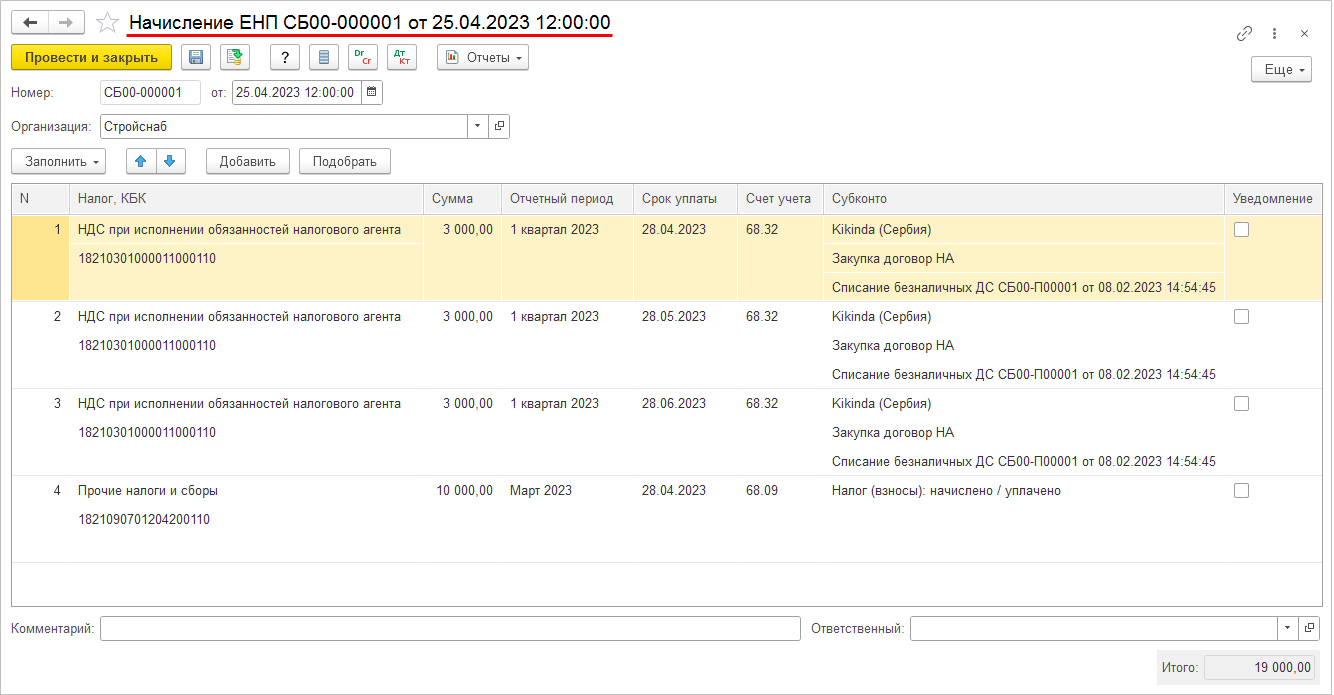 Заполнение табличной части документа Начисление ЕНП по типу налога НДС при исполнении обязанностей налогового агента имеет следующие особенности: