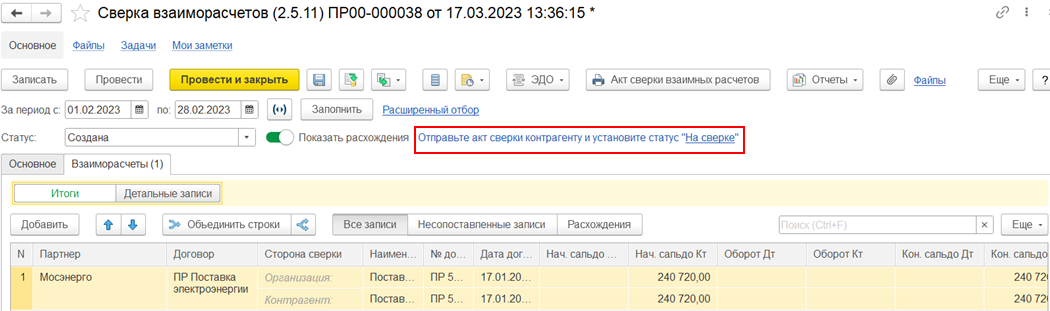 В статусе «Создана» на форме сверки появляется надпись «Отправьте акт сверки контрагенту и установите статус «На сверке».