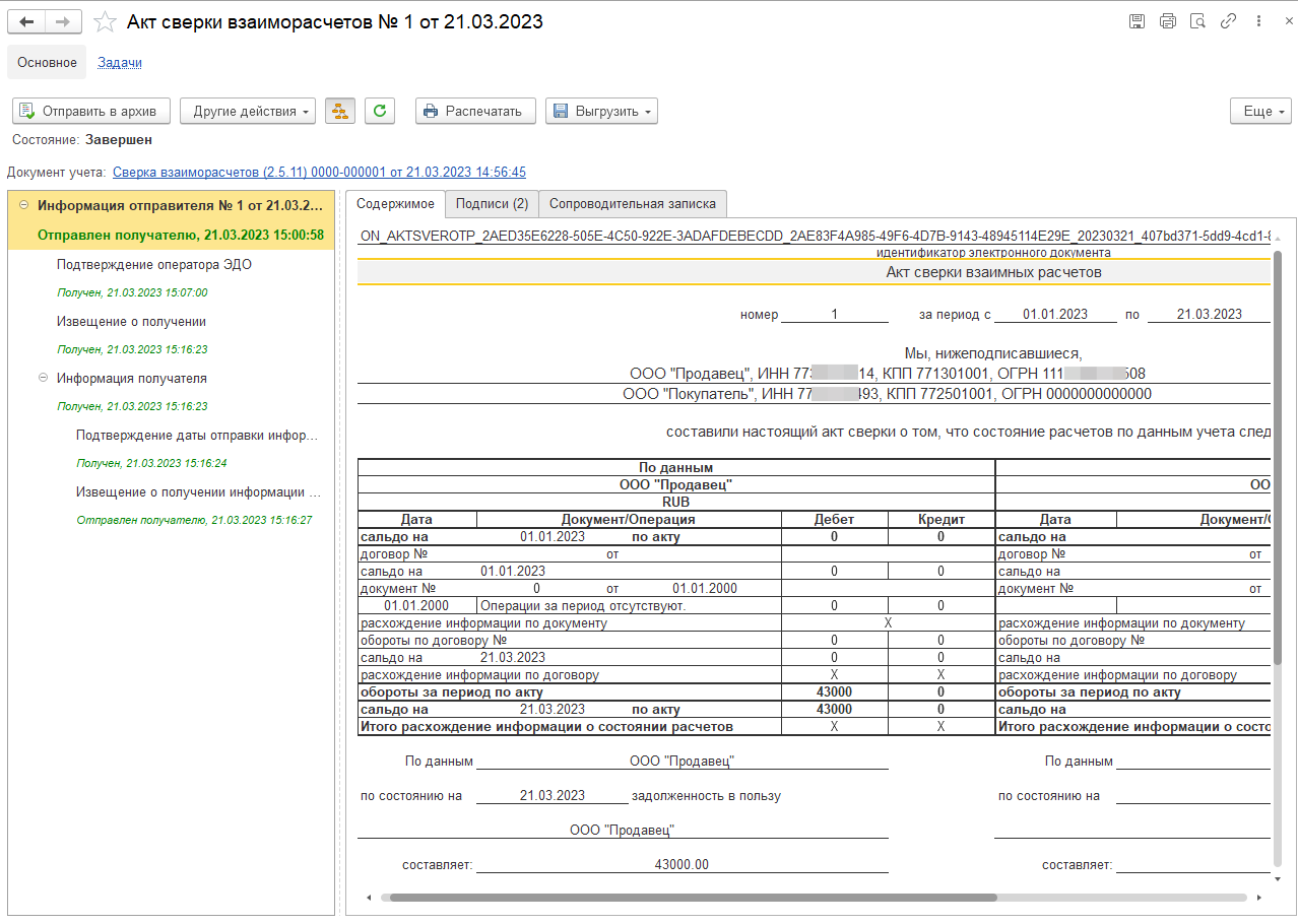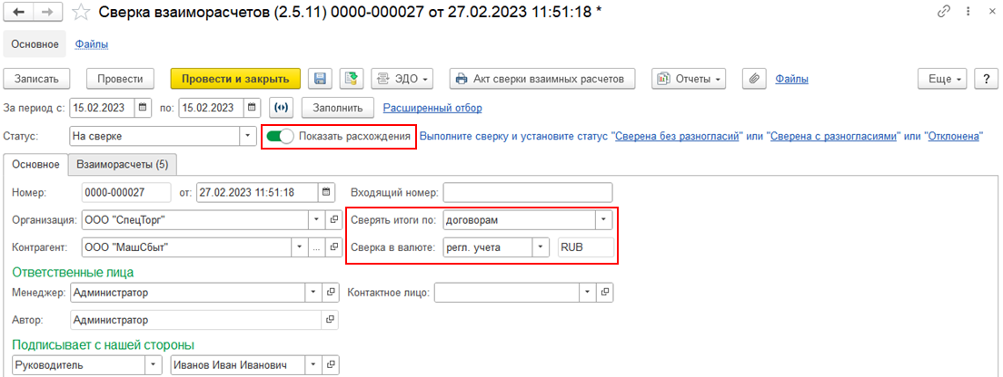 После того, как получатель выполнил ответное действие, статус сверки будет изменен автоматически, например, на «Сверена с разногласиями» (при использовании ЭДО).