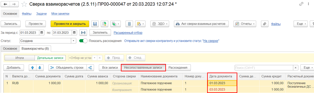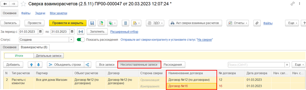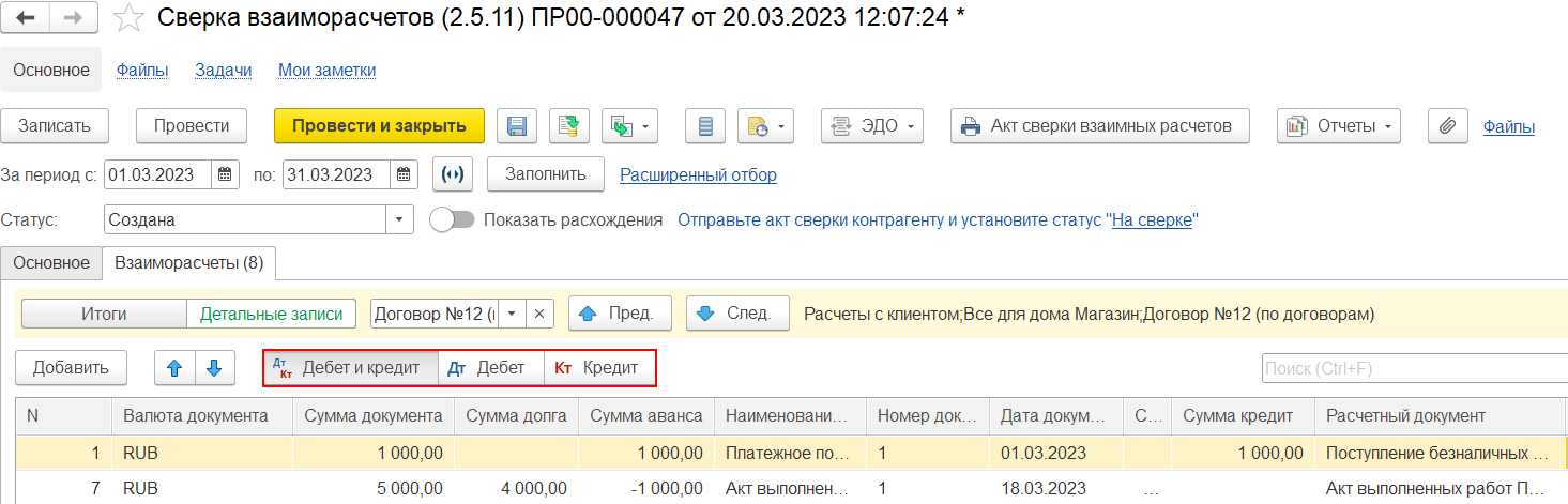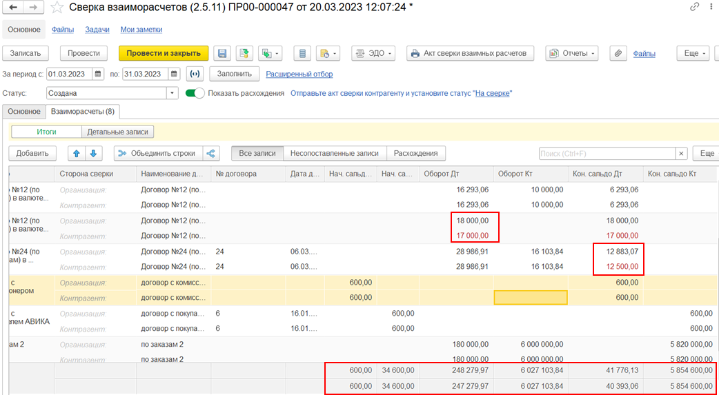 На закладке Взаиморасчеты как в режиме Итоги, так и в режиме Детальные записи при установленной настройке Показать расхождения предусмотрены дополнительные возможности: