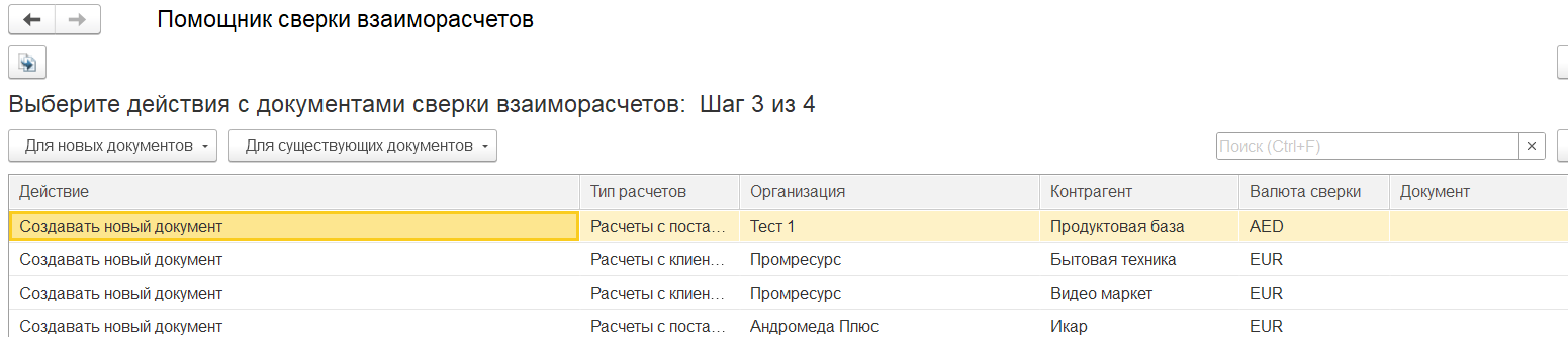 На шаге 3 помощника создания сверок взаиморасчетов можно выбрать действие с документами сверки взаиморасчетов. На этом шаге также можно убедиться, что будут созданы требуемые документы. При необходимости отменить создание части документов.