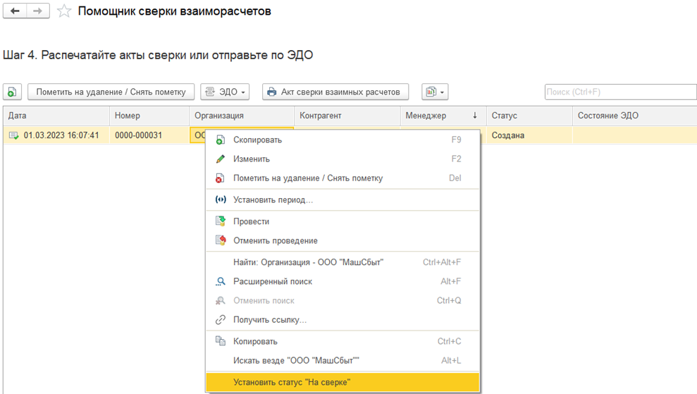 На шаге 4 отображаются созданные документы Сверка взаиморасчетов в статусе Создана. В контекстном меню предусмотрена команда для установки статуса На сверке (Установить статус «На сверке»).