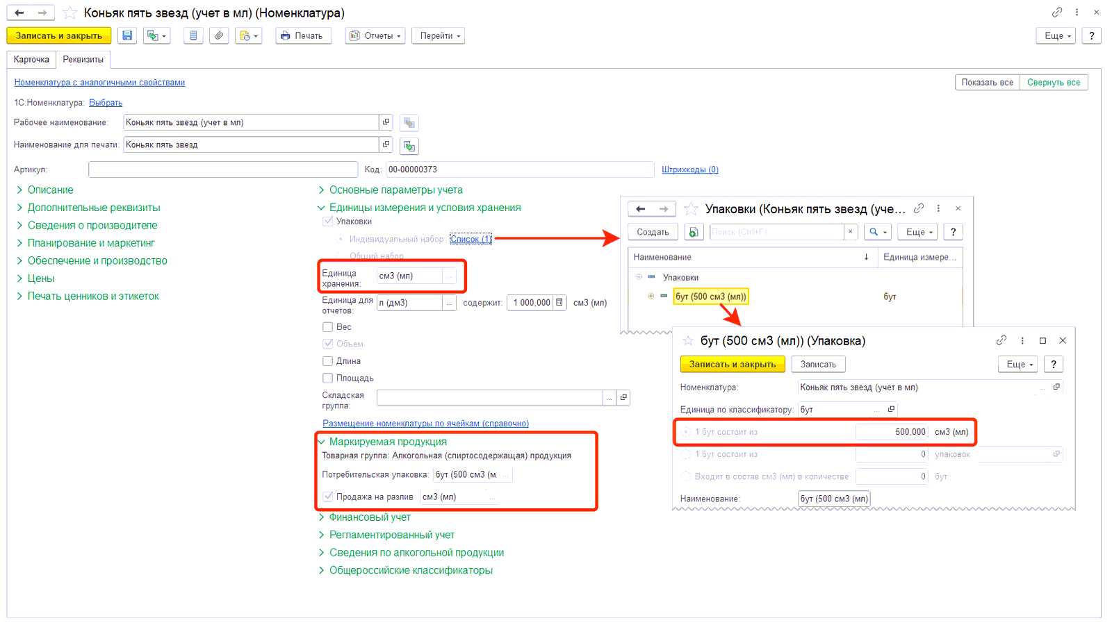 Единицу частичного выбытия, соответствующую 1 мл, необходимо добавить вручную и указать вариант пересчета: 1 бут состоит из … мл (разупаковка). В данном варианте настройки в актуальных версиях не предусмотрен выбор единицы объема по классификатор см3(мл) в силу ограничения работы с упаковками.