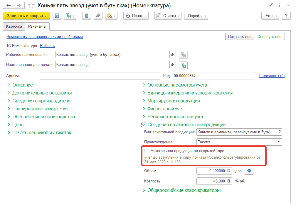 В карточке номенклатуры, которая используется для отражения операций с алкогольной продукцией в соответствии с актуальными требованиями, должен быть снят флаг Алкогольная продукция во вскрытой таре в группа реквизитов Сведения по алкогольной продукции. Для отражения операций в соответствии с актуальным требованиями приказа Росалкогольрегулирования от 31 мая 2023 г. N 156 нельзя использовать карточки номенклатуры с установленным флагом Алкогольная продукция во вскрытой таре, которые ранее применялись для отражения операций в соответствии с приказом Росалкогольрегулирования от 19.06.2015 № 164.
