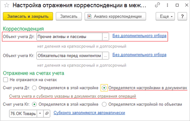 При выборе в форме настроек корреспонденций объекта учета Прочие активы и пассивы изменена подпись у элемента выбора источника счета с Определяется настройкой по объектам на Определяется настройками в документах.