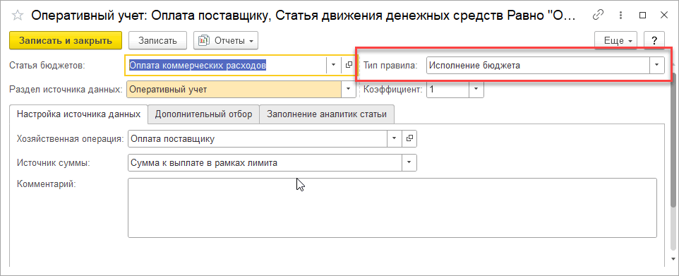 Если использование лимитов ведется по данным бюджетирования, то в рабочем месте Настройка правил получения фактических данных бюджетирования на закладке Исполнение бюджета необходимо открыть правило и в поле Тип правила временно заменить значение Исполнение бюджета на Фактические данные. Далее необходимо установить флаг Хранить результат выполнения правила. Далее после включения функциональной опции По корреспондирующим регистрам остатков необходимо будет Тип правила вернуть на значение Исполнение бюджета.