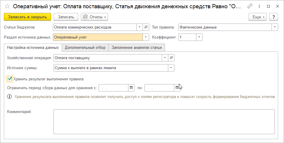 Также перед изменением настройки по получению фактических данных по статьям бюджета необходимо включить хранение факта по всем правилам по данным оперативного учета.