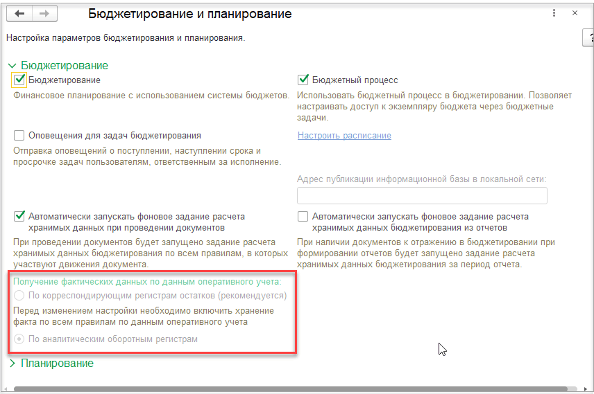 Настройку Автоматически запускать фоновое задание расчета хранимых данных при проведении документов рекомендуем включить, если необходимо оперативно обновлять фактические данные бюджетирования, а также при отсутствии замедления работы базы после включения данной функциональной опции.