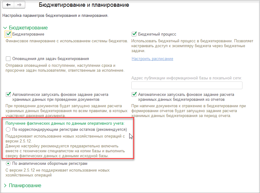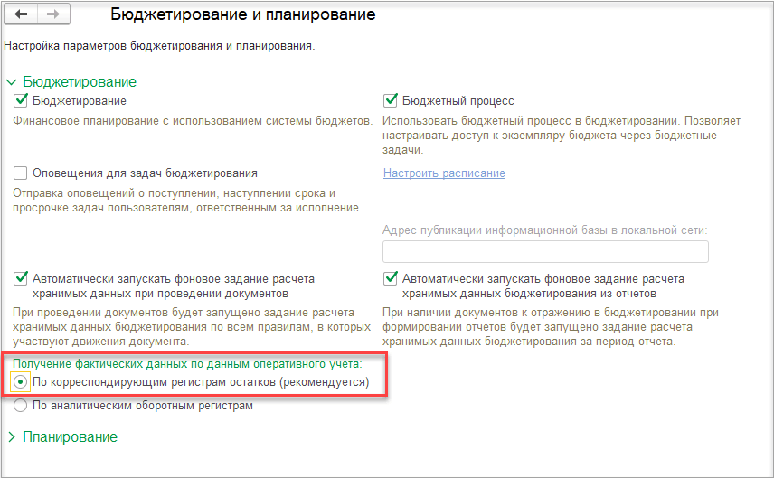 В раздел НСИ и администрирование – Настройка НСИ и разделов – Бюджетирование и планирование – Бюджетирование для перевода сбора фактических данных по статьям бюджета в оперативном учете по данным балансовых регистров добавлен переключатель Получение фактических данных по данным оперативного учета: По корреспондирующим регистрам остатков, По аналитическим оборотным регистрам.