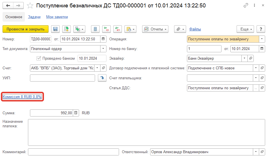 ■ При зачислении на банковский счет - банк зачисляет оплату от покупателей на расчетный счет за минусом комиссии. В учете отражается документ Поступление безналичных ДС с видом операции Поступление оплаты по эквайрингу. Удержанная банком комиссия указывается в документе в поле Назначение платежа. По ссылке Комиссия можно указать сумму комиссии, подразделение, статью и аналитику для отражения суммы комиссии в расходах.