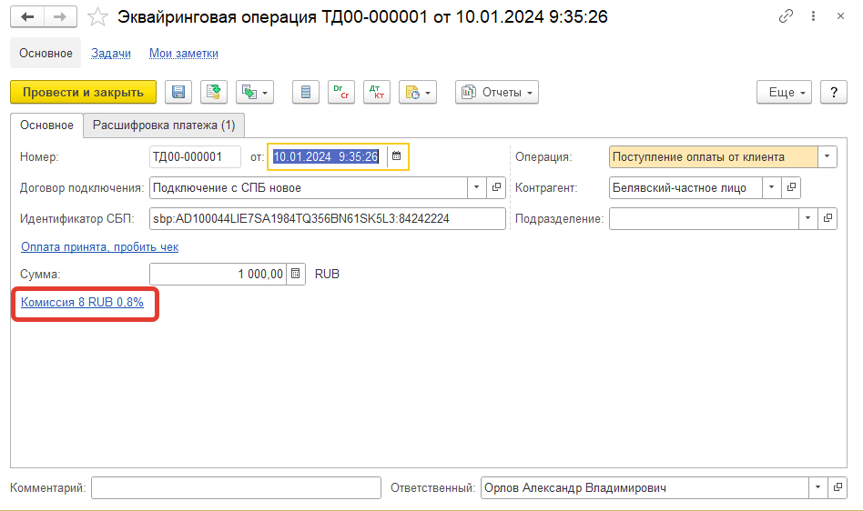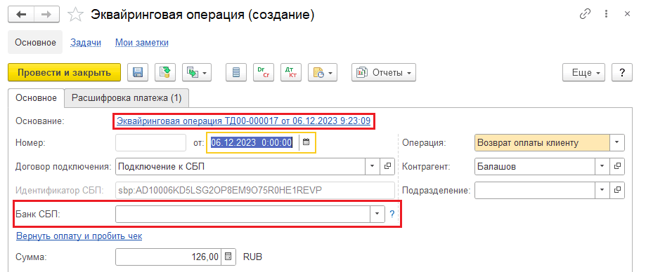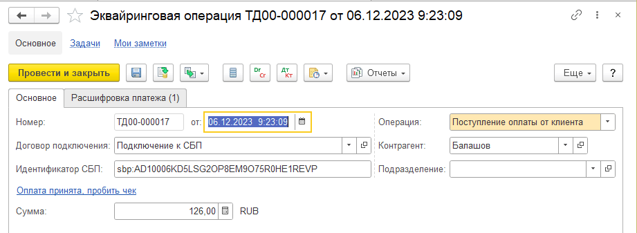 По факту оплаты регламентным заданием Загрузка статусов операций СБП будет автоматически зарегистрирован документ Эквайринговая операция с операцией Поступление оплаты от клиента. В документ «Эквайринговая операция» будет записано значение идентификатора оплаты СБП для возможности проведения возврата оплаты.