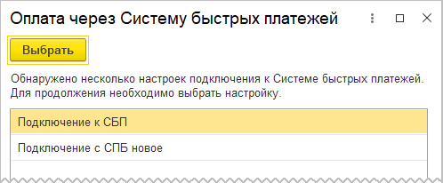 По нажатию кнопки Оплата через СБП, если настроено более одной настройки подключения к платежной системе, открывается выбор настройки (сценарий БИП), в которой пользователь выбирает нужную настройку подключения.