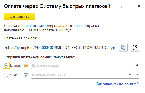 Также платежную ссылку можно скопировать в буфер обмена (кнопка копирования справа от ссылки) для последующей передачи клиенту через внешние каналы, а также направить письмом на электронную почту или в виде SMS-сообщения непосредственно из информационной базы. При первой отправке ссылки по sms или email необходимо указать шаблоны сообщений. Далее выбранные ранее шаблоны будут подставляться автоматически.