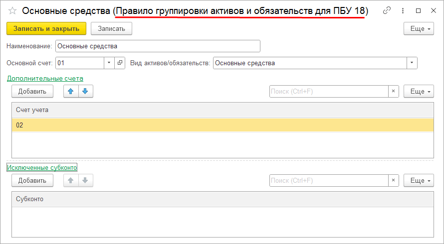 Если настроено Основной счет = 01, Дополнительный счет = 02, Вид активов/обязательств = Основные средства и в Исключенные субконто добавлен вид субконто «Основные средства», тогда отложенные налоги будут считаться не по каждому объекту основных средств, а в целом от разницы в оценке на 01 и 02 счетах.