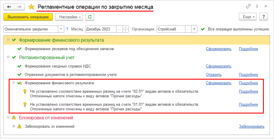 В регламентную операцию Формирование финансового результата процедуры Закрытие месяца добавлена проверка того, для всех ли счетов, на которых включен налоговый учет, настроено соответствие виду активов/обязательств.