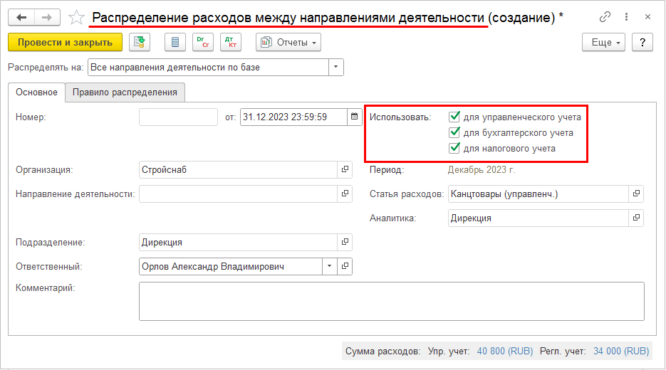 Выбор источника данных в документе Распределение расходов между направлениями деятельности определяет то, из какого регистра оперативного учета должна формироваться база распределения расходов для данного документа: Финансовые результаты (распределение расходов по данным управленческого учета) или Выручка и себестоимость продаж (для распределения расходов в управленческом учете из регистра берутся данные о выручке и/или себестоимости в управленческом учете, для распределения расходов в регламентированном учете из регистра берутся данные о выручке и/или себестоимости в регламентированном учете). Выбранный источник данных определяет источник формирования базы распределения расходов для всех видов учета, отмеченных в документе в списке Использовать.