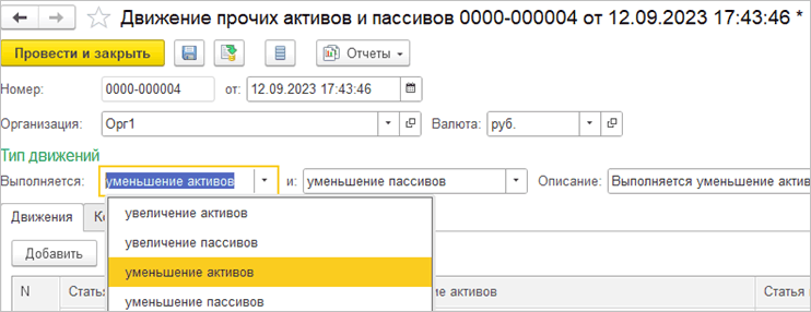 Расширена функциональность документа Движение прочих активов и пассивов операциями по уменьшению активов и пассивов, появились новые типы движений: