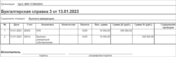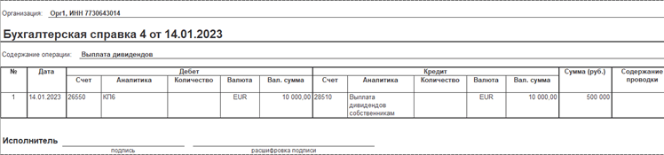 В документе Операция (международный учет) реализована печать бухгалтерской справки с использованием стандартной подсистемы «Печать».