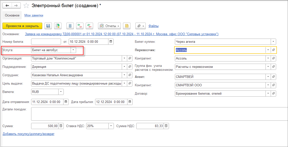 Появилась возможность загружать полученные данные от сервиса Smartway как билет на автобус. Теперь в системе создается документ с типом услуги Билет на автобус и описанием, характерным для этой услуги.