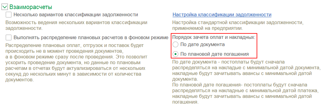 В режиме ведения взаиморасчетов Онлайн поддерживается Порядок зачет оплат и накладных (НСИ и администрирование – Настройка НСИ и разделов – Казначейство и взаиморасчеты – Взаиморасчеты):
