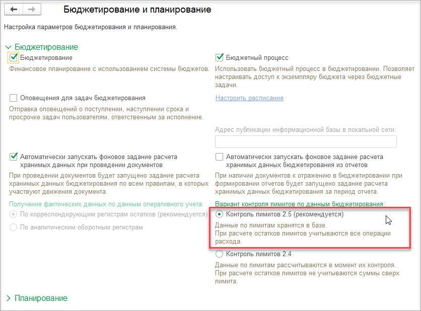 Для включения нового варианта контроля следует установить переключатель в значение Контроль лимитов 2.5 (рекомендуется).
