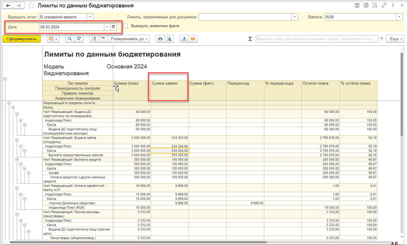 Фактическое потребление сумм по лимитам отражается в периоде лимитирования по фактической дате платежа, если платежный документ проводится без заявок. Если платежный документ сформирован по заявке на расход ДС или заявке на командировку, то по плановой дате платежа.