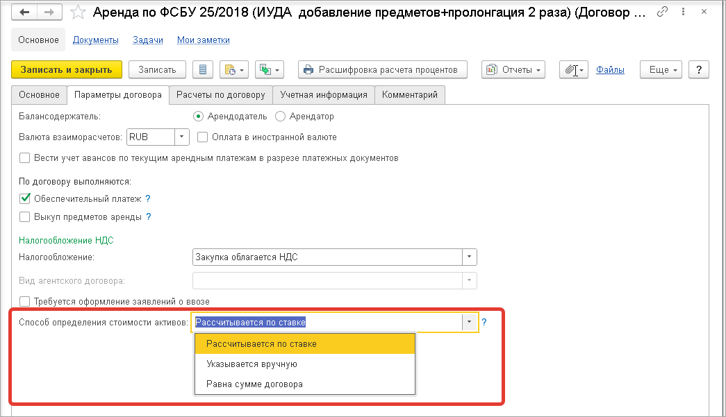 С версии 2.5.18 в договоре аренды группа Способ определения стоимости предметов аренды переименована Способ определения стоимости активов и добавлен выпадающий список с вариантами: