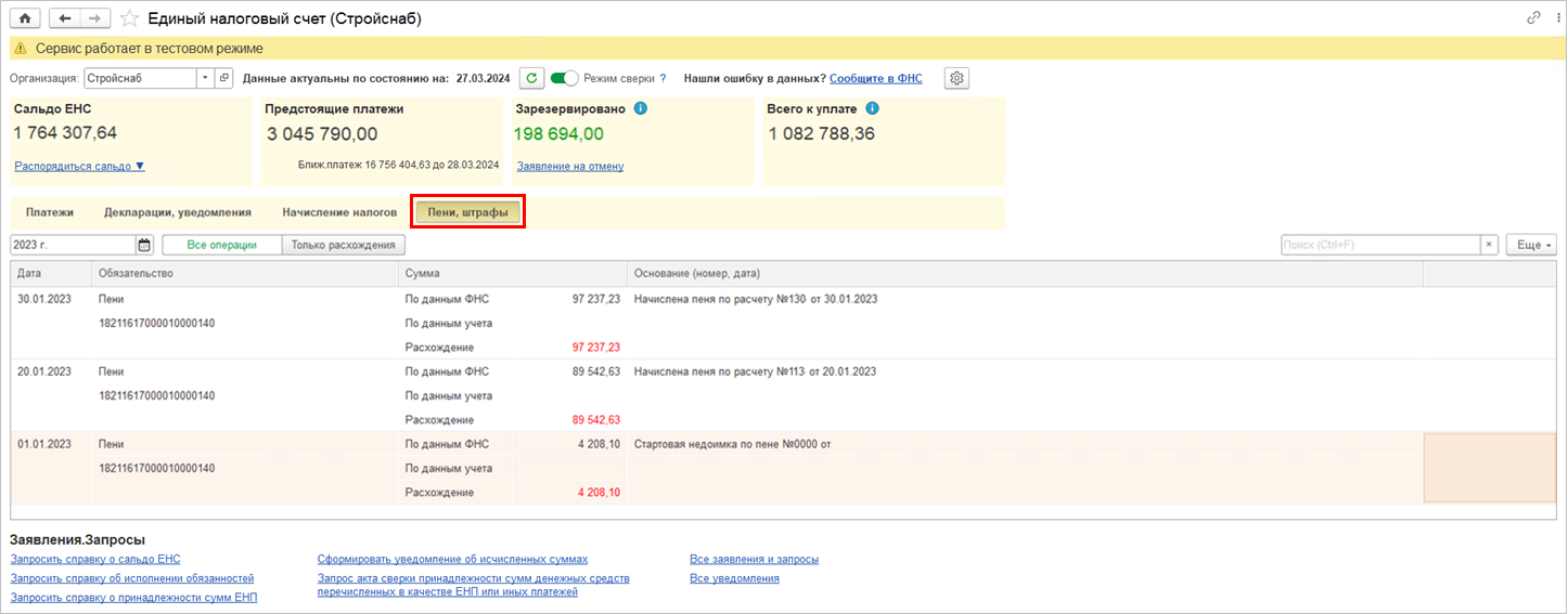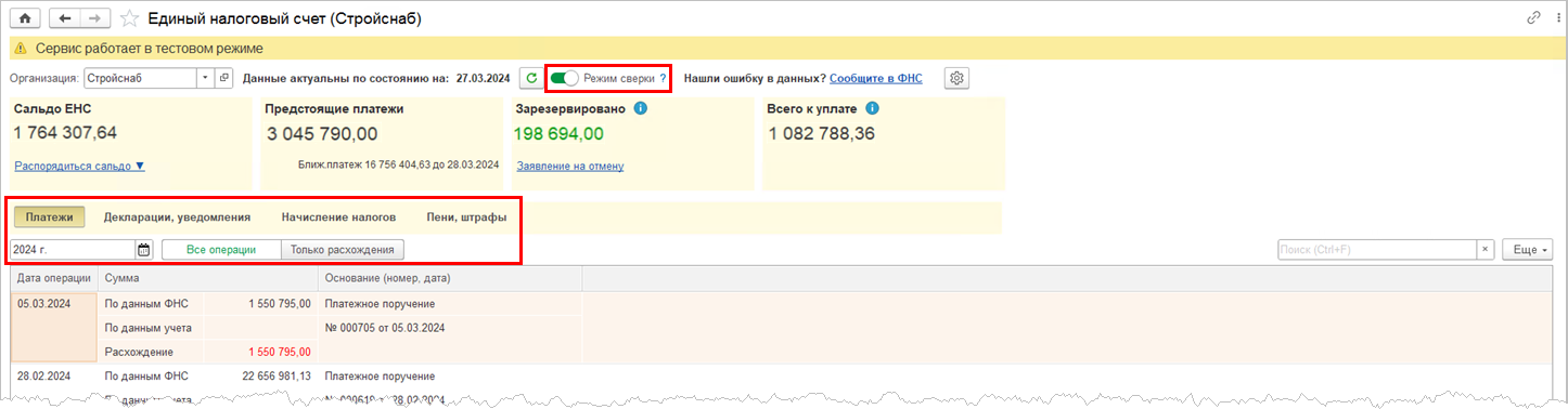 В рабочем месте Единый налоговый счет добавлен переключатель Режим сверки. Если указанный переключатель отключен, тогда рабочее место работает в режиме отображения текущего состояния расчетов на ЕНС по данным ФНС.